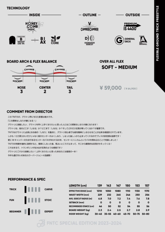 この TNTⓇが、グラトリ界に与えた影響は絶大です。「この柔軟なしなりが癖になる!」グラトリに挑戦したい、グラトリを早く上手くなりたいと思った人にはこの柔軟なしなりが癖になります!グラトリは、板のどこが『しなる』か?どこまで『しなる』か?そしてどれだけ反発が帰ってくるか?が重要です。TNTⓇはグラトリに必須となる板の『しなり』を重点に、グラトリ初心者でも板を簡単にしならせることが出来る様設計されています。しかも!ただ柔らかいだけじゃなく板のセンターがよくしなり、しなった後しっかり止まってくれるのでプレスの安定感は抜群です!更に W キャンバーの欠点であるセンターのバネが失われるのを、センターにハニカムというバネを埋め込むことで克服しました!TNTⓇの特徴を端的に説明すると、簡単にしなった後、程よいところで止まって、そこから爆発的な反発がかえってくる!これはまるで、トランポリンが生み出す反発のような感覚です♪グラトリにこれから挑戦したい!上手くなりたいと思ったあなたには最高の一本!