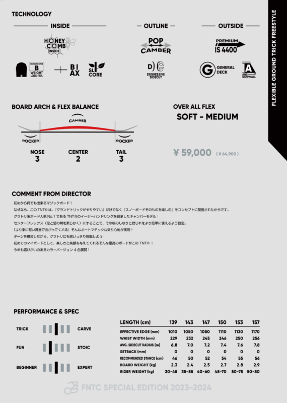 初めから何でも出来るマジックボード!なぜなら、このTNT©は、『グランドトリックがやりやすい』だけでなく『スノーボードそのものを楽しむ』をコンセプトに開発されたからです。グラトリ系ボード人気No.1 であるTNTⓇのイージーハンドリングを継承したキャンバーモデル!センターフレックス(足と足の間を柔らかく)にすることで、その板のしなりと捻じれをより簡単に使えるよう設定。『より楽に軽い荷重で曲がってくれる』そんなオートマチックな乗り心地が実現!ターンを練習しながら、グラトリにも思いっきり挑戦しよう!初めてのマイボードとして、楽しさと笑顔を与えてくれるそんな最高のボードがこの TNT©!