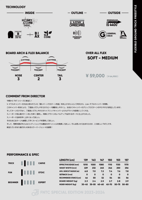 V- ダブルキャンバーの欠点と言われていた「硬いバーンでのターン性能」を向上させたいという考えから、Low-ダブルキャンバーを開発。このキャンバー形状により、丁度良いズラしやすさがスピード調整をしやすくし、なおかつキャンバーのグリップ力でターンのやりやすさを両立しています。そしてターンだけでなく、丁度良いズラしやすさがハイブリッドキャンバーよりもグラトリを容易にしてくれる。スノーボード初心者がターンをいち早く 習得し、同時にグラトリのレベルアップも計れるボードに仕上がりました。スノーボード全体を早く上手くなって欲しい。そのためにはターンも練習して早くカービングを習得して欲しい。そして、雪質を選ばずどんなコンディションでも最高のポテンシャルを発揮して欲しい。 そんな思いから生まれたのが、この新しいTNTⓁです。