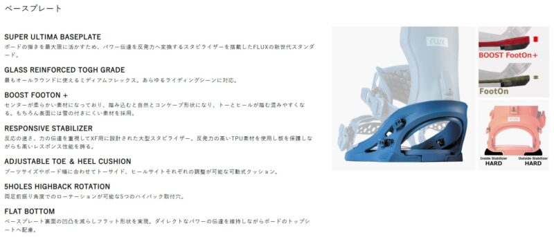 • ベースプレート: 「Super Ultima Baseplate」を一新し、パワー伝達を反発力に変換する大型の「Responsive Stabilizer」をヒールサイドに搭載しています。これにより、左右への可動域を確保しつつ、力をロスなくボードに伝え、より力強いエッジングを可能にしています。