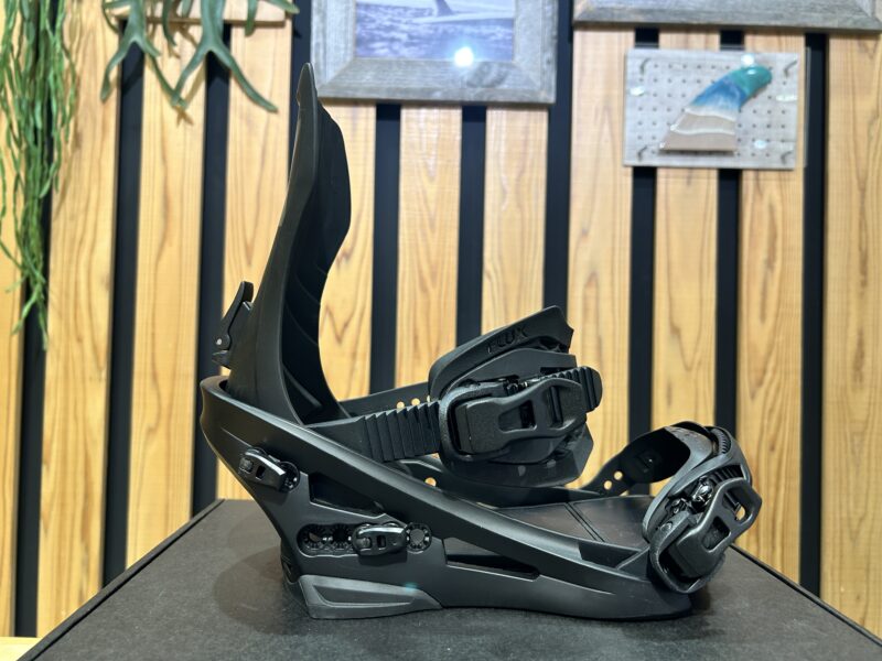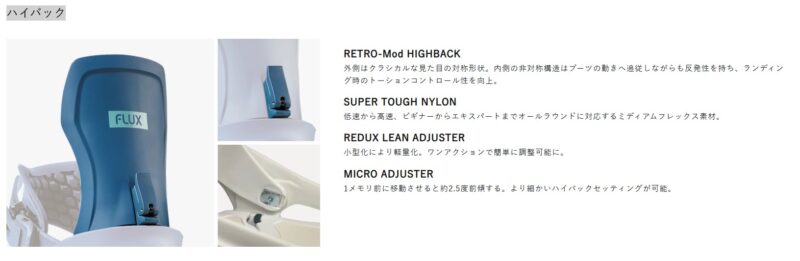 • ハイバック: 外側はクラシカルな見た目の左右対称形状ですが、内側はブーツの動きに追従する非対称構造の「Retro-Mod Highback」を採用しています。これにより、ランディング時のトーションコントロール性(ねじれ剛性)を向上させながらも、反発性を維持しています。素材には、低速から高速までオールラウンドに対応するミディアムフレックスの「Super Tough Nylon」を使用しています。
