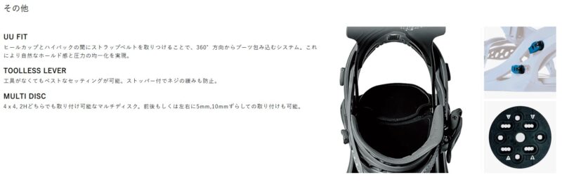 • 調整機能: 工具なしでセッティングが可能な「Toolless Lever」や、ブーツを360°包み込む自然なホールド感を実現する「UU Fit」システムなど、日本人向けのきめ細やかな調整機能が充実しています。