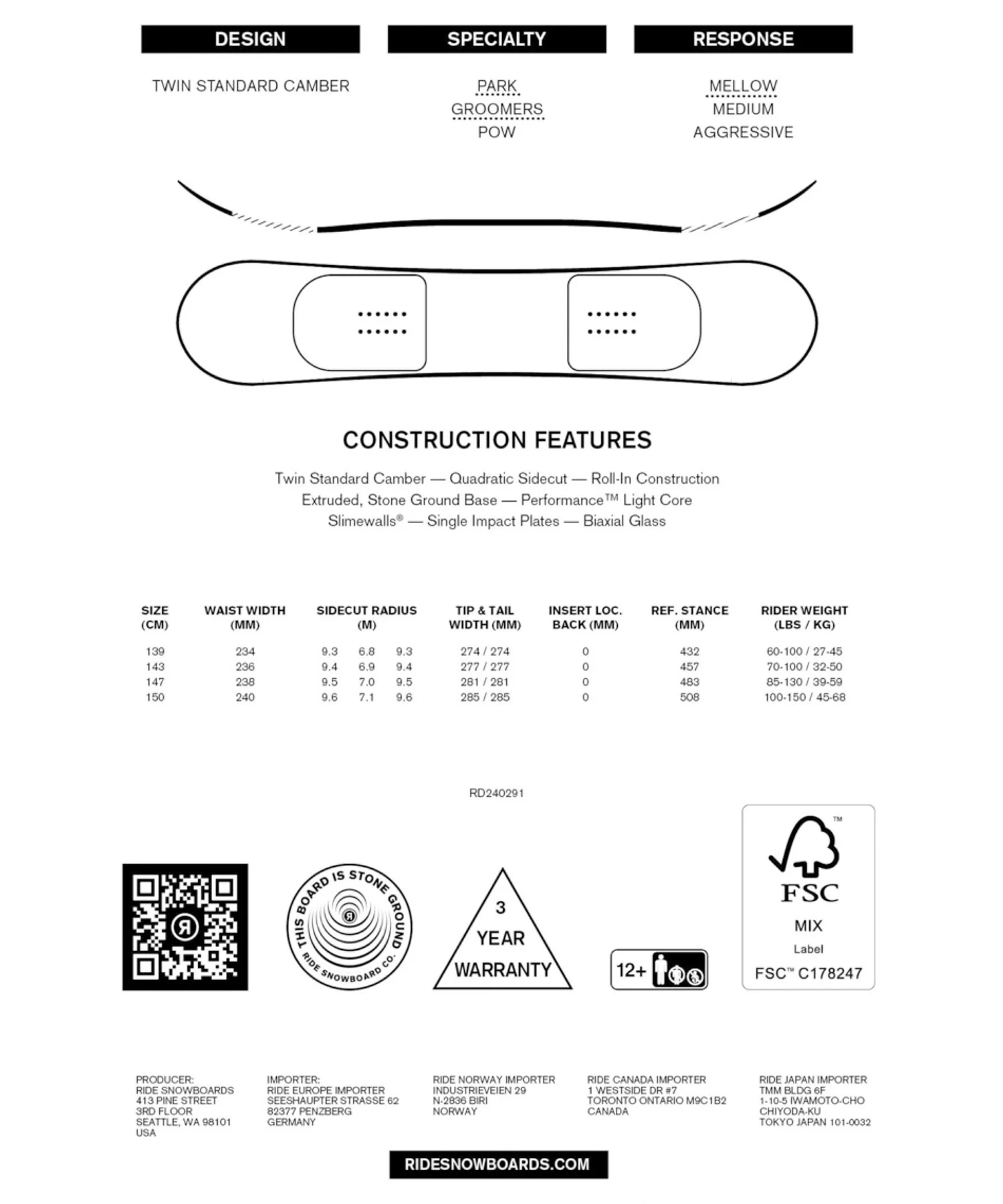 耐久性のあるビギナーむけハイブリットキャンバーボード。ソフトフレックスで操作性抜群です。ツインチップのためグラトリやジブにも対応。耐久性に定評のあるRIDEのボードなので、長く使用できステップアップの後押しをしてくれること間違いなしのアイテムです。