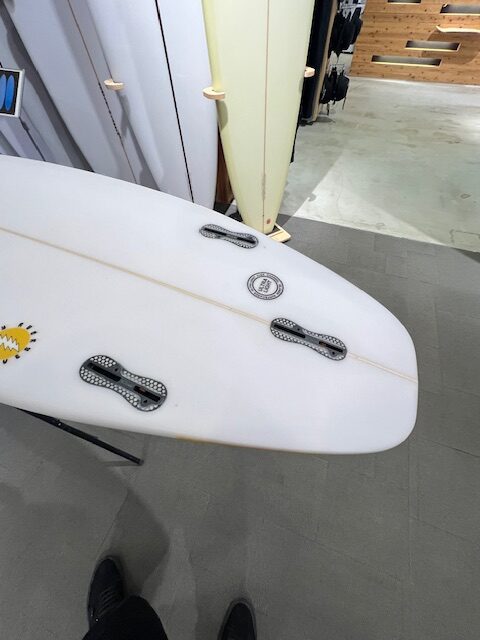 前足あたりのシングルコンケーブがアクセルとなり、フィンの間のダブルコンケーブが小波でもレールからレールへの切り返しを楽にしてくれる。