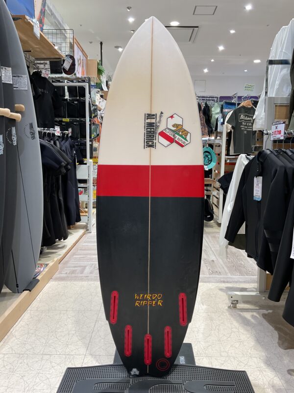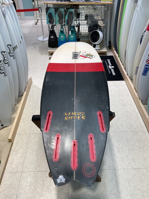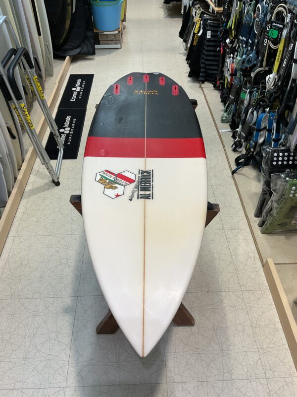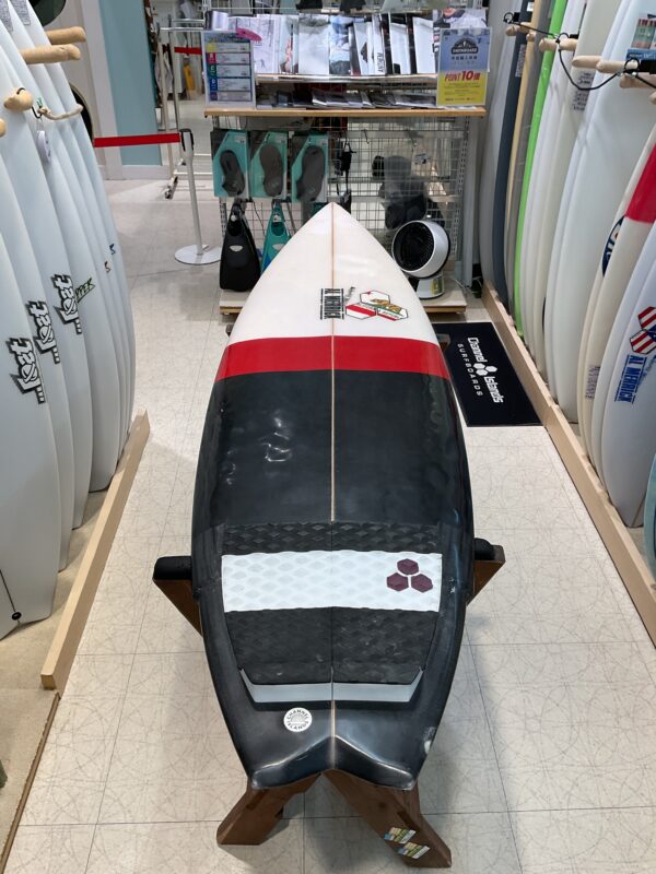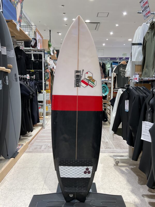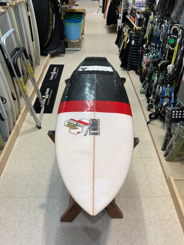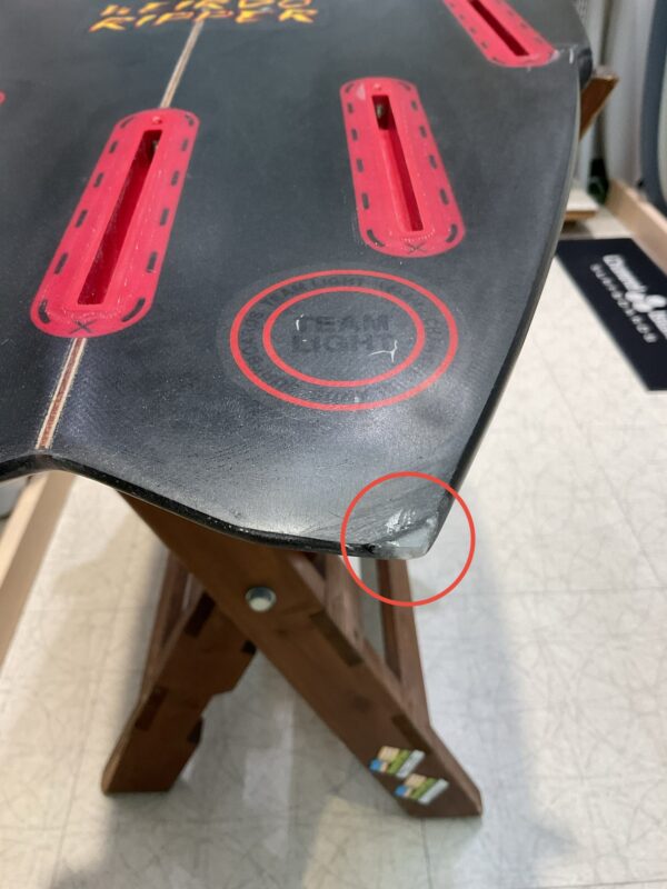 全体的にフットマークが入っていて、ノーズ先端に薄っすらステッカーの日焼け跡が入っています。ボードに記載されているサイズが見えないので全て実寸値で長さは5’4 1/2”(163.8cm)です。