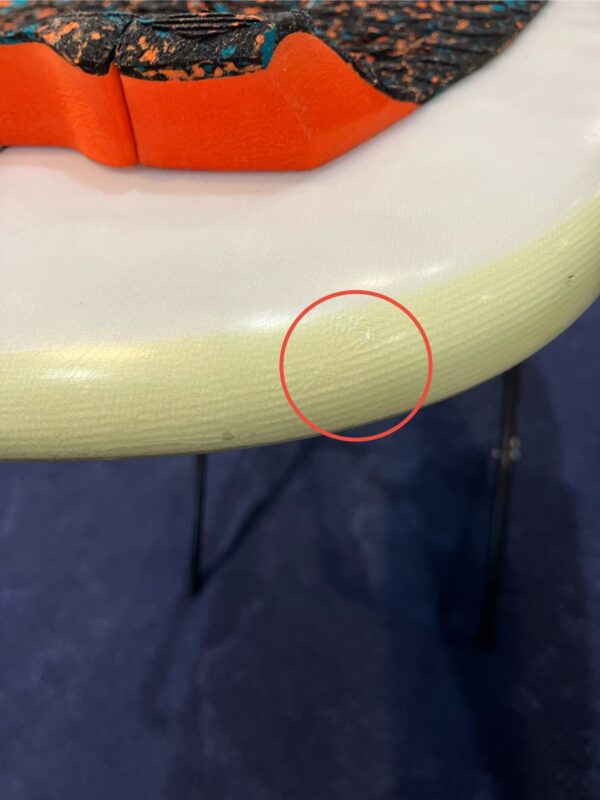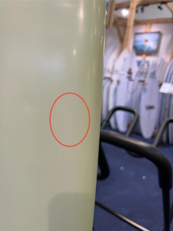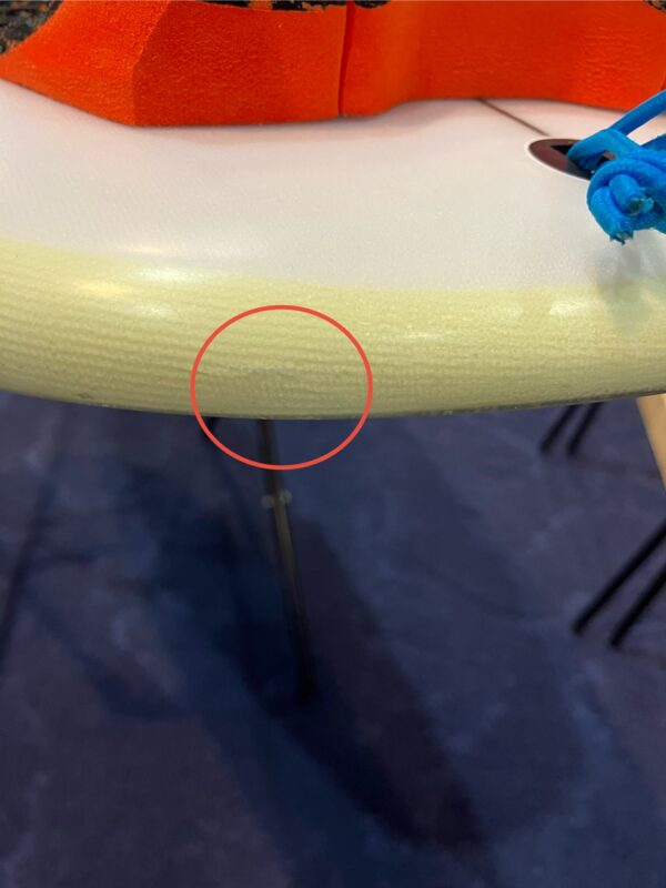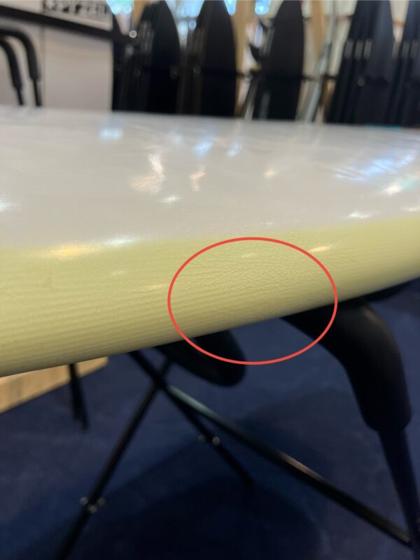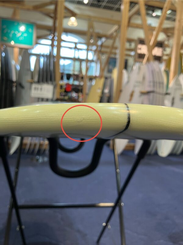 デッキ面を表にテールからノーズを見て上部左レールにクラック