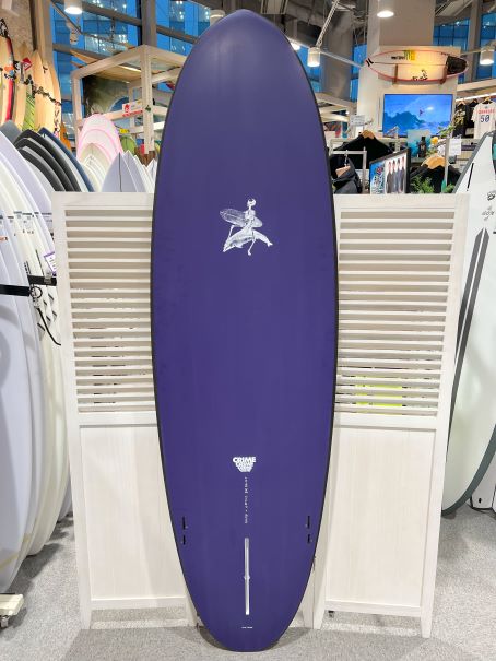 CRIMEサーフボードのデッキには、ワックス不要でグリップ性に優れたクロコダイルバックスキン素材が使われています。ボード全体の素材としては、EPSフォーム(発泡スチロール)をベースにエポキシ樹脂でラミネートされたシェイプされたハードボードに、ソフト素材のデッキを組み合わせることで、ビギナーでも扱いやすい特徴を持っています。