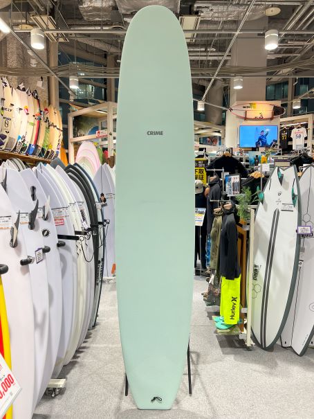 CRIMEサーフボードのデッキには、ワックス不要でグリップ性に優れたクロコダイルバックスキン素材が使われています。ボード全体の素材としては、EPSフォーム(発泡スチロール)をベースにエポキシ樹脂でラミネートされたシェイプされたハードボードに、ソフト素材のデッキを組み合わせることで、ビギナーでも扱いやすい特徴を持っています。