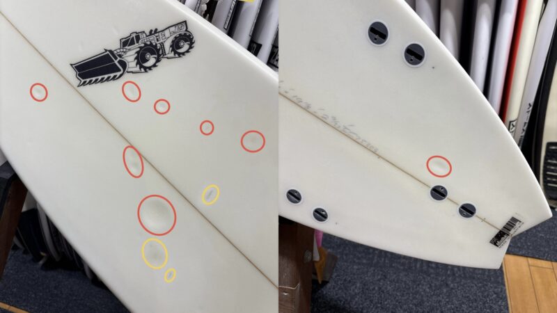 ボトム面、小さな凹みが数か所 ( 赤〇 ) 、2か所修理 ( 黄色〇 ) をしています。