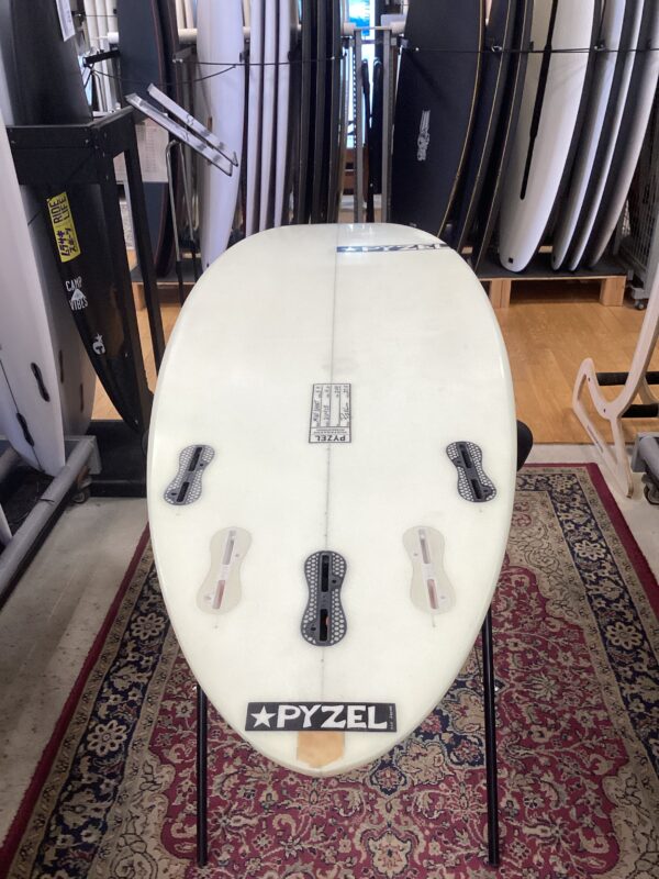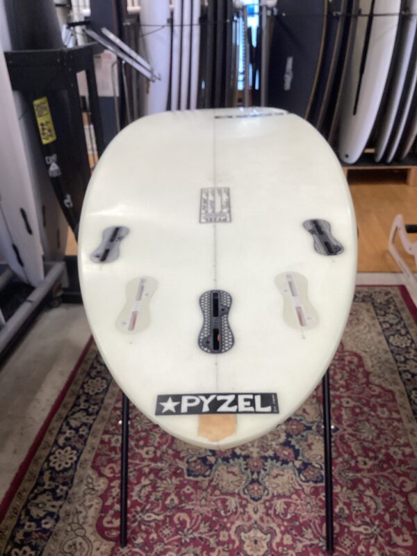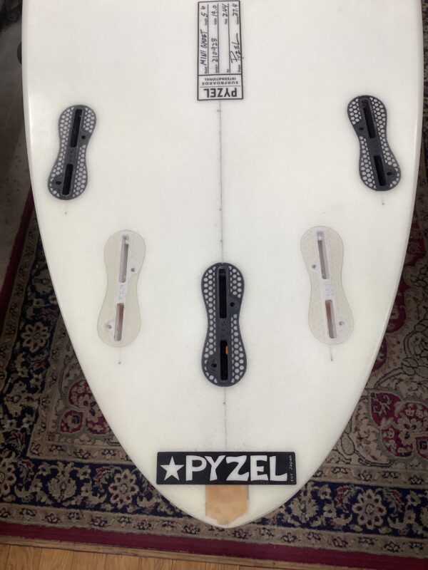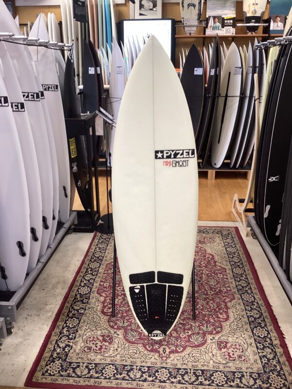 コアの5’9″を5’5″に縮小し、フロートを増やすために、ワイドを広げ、デッキを平らにし、レールをより厚く、より箱型にしました。そしてノーズの厚みを更にUPし胸の部分の下からノーズまで浮力追加されたボリューム量は重要なポイントです。ちなみに5’10″ゴーストXL(ハイボリュームモデル)は28.80リットルですが、5’7″ミニゴーストは28.70リットルもあります。そしてロッカーにもいくつかの小さな変更を加えました。それはラウンドテールまたは幅の広いバンプスカッシュのいずれかで提供され、小さくて弱い波でボードを最強に楽しくします。