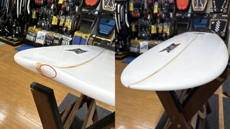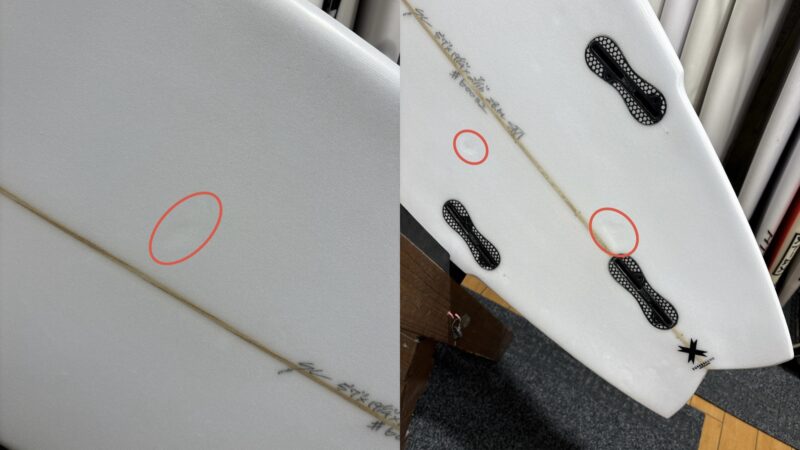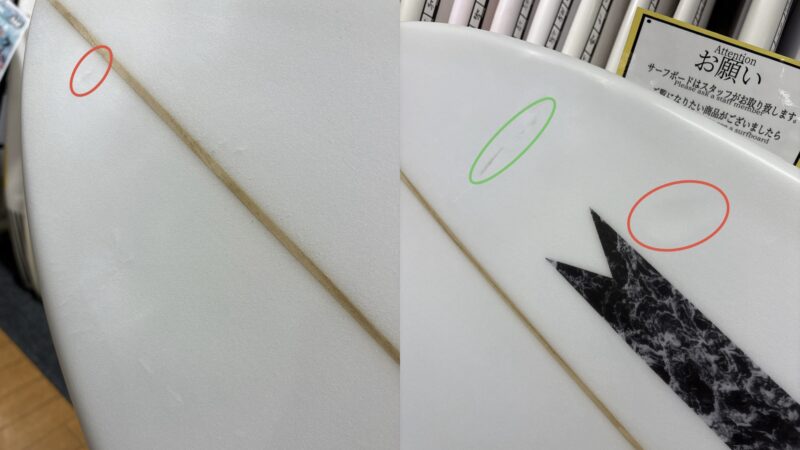 ボトム面、ノーズ寄りに1か所修理跡 ( 緑〇 ) 、浅いですが凹みが有ります。