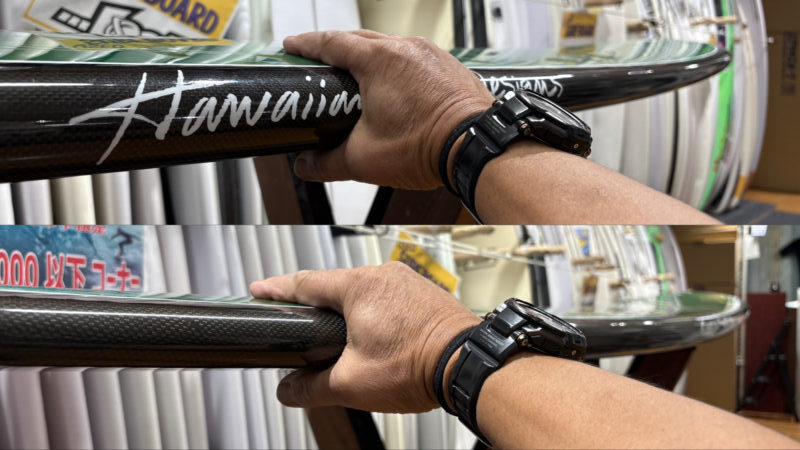 ボトムはノーズコンケイブ~ラウンドV、テールはラウンドピンテールに。