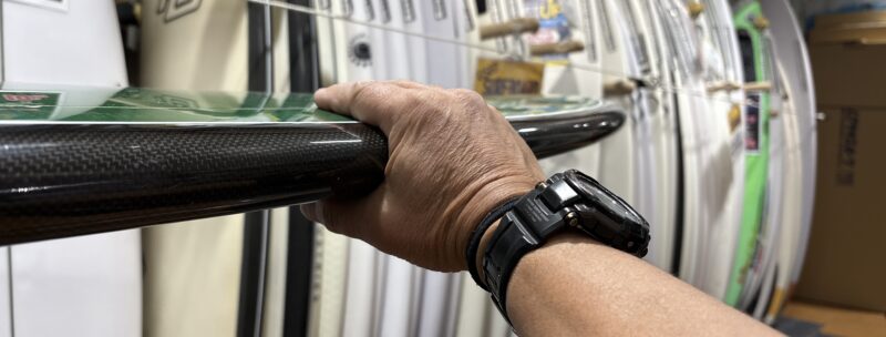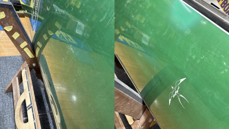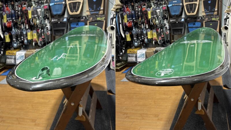 ロッカーはノーズ・テールともに緩やかに、カーボンラップにグリーンのパネルカラーが施され、