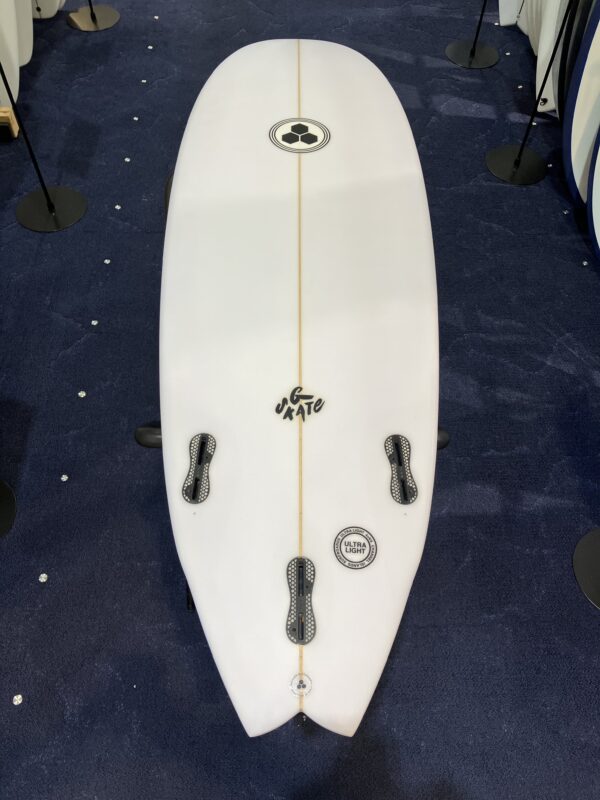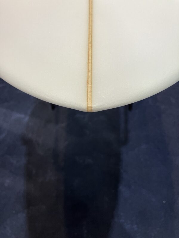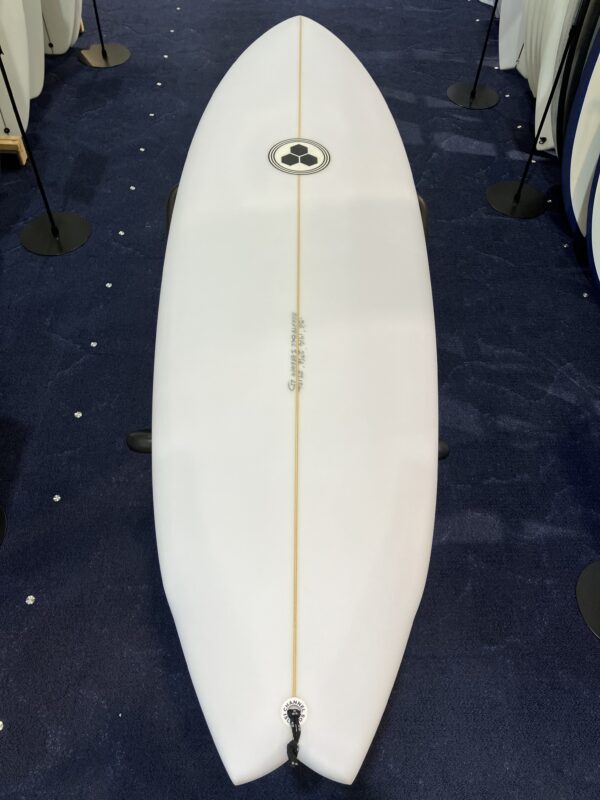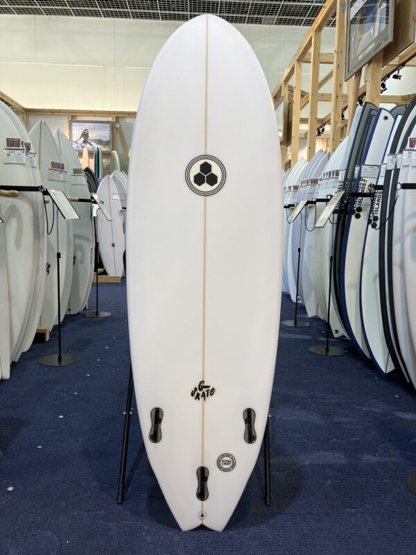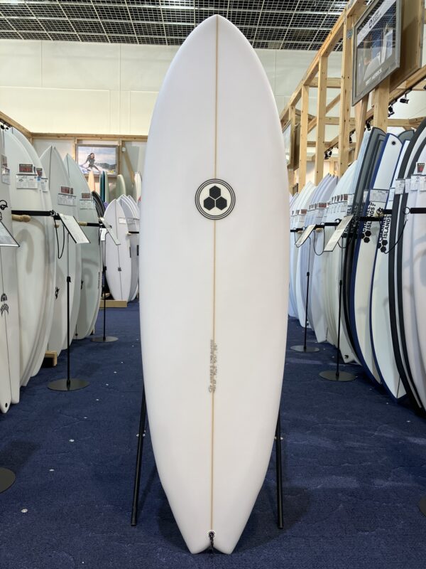 アウトラインはワイドポイントフォーワードで、一番幅の広いゾーンを前寄りにすることによりテイクオフから抜群のスピードを得ることができます。テールエリアのアウトラインも段階的にかなり絞られたスワローテールで今までにない独特なアウトライン形成しています。ロッカーの全体感はフラットロッカーに近く接水面が多く確保できていることで、スピード性が高い理由はここにもあると言えます。