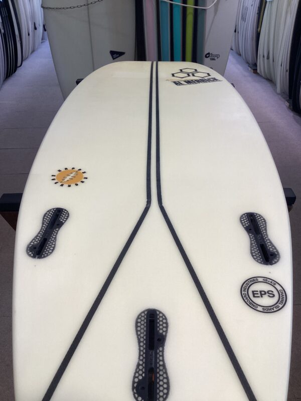 前足あたりのシングルコンケーブがアクセルとなり、フィンの間のダブルコンケーブが小波でもレールからレールへの切り返しを楽にしてくれる。
