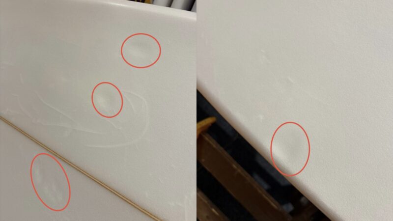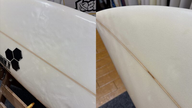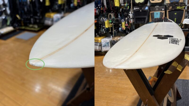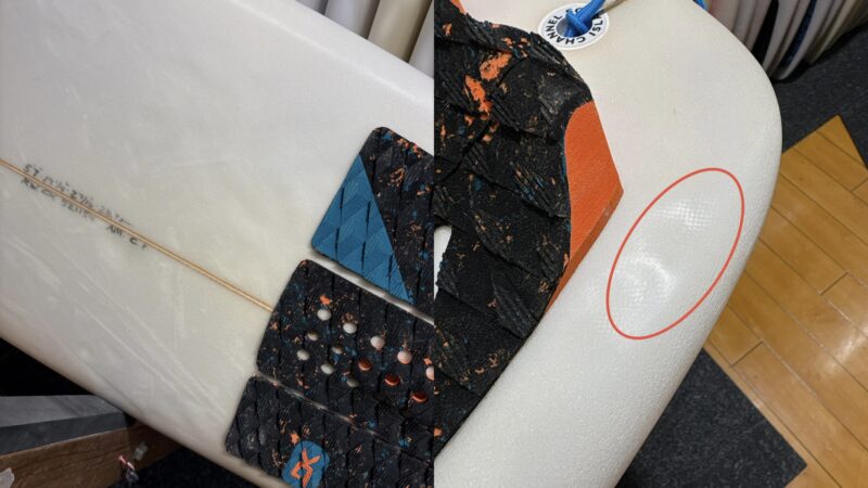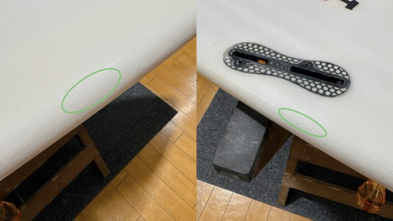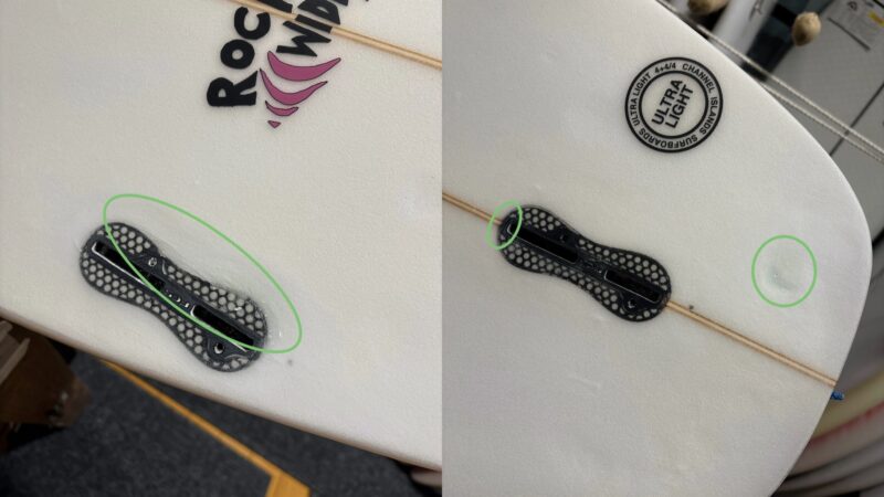 ボトム面、小さな凹み ( 赤◯ ) 、修理跡 ( 緑◯ ) があります。FINBOXのクラックを修理しています。