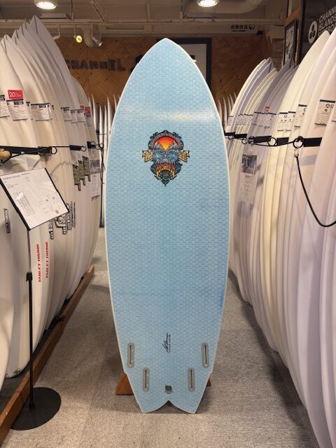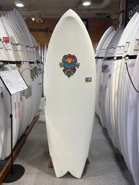 ウィングスワローテールで鋭いターンやカービングも可能。アートワークはドリュー・ブロフィーが担当し、外観にもこだわった一本です。