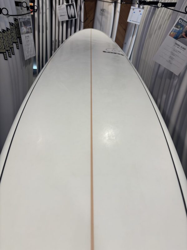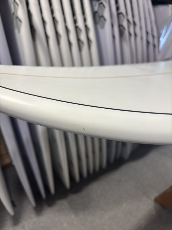 波が跳ね上がってきたら、後ろに下がるとボードが変形します。引き込まれたテールと、センターからフィンにかけて伸びるV字カーブのおかげで、ボードの長さよりも短く感じるでしょう。