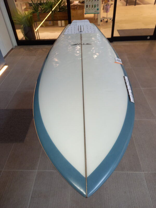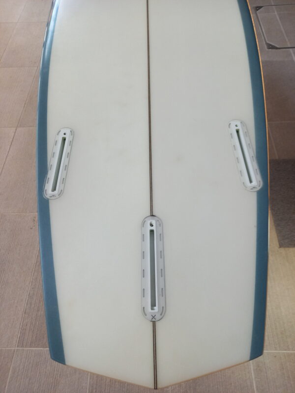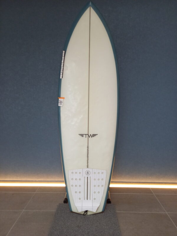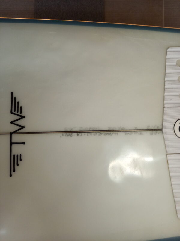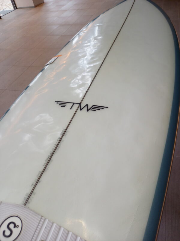 一見不恰好にさえ見えるスーパーワイドダイアモンドテイルは、ツインフィッシュの切込み部をダイアモンドに変えた。 その為ツインFINのようなドライブ感が有るが、ターンの最終段階で、ダイアモンドテイルの先端が作用、ピポット的な一点を中心に回転するシャープな感覚、リッピング時の板の返りを非常に良くしている。