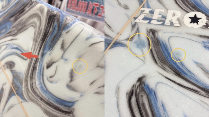 新品未使用品であっても、店舗にて展示中についた細かい傷がある場合もございます。中古ボード特有のものでございまして、価格がお安くなっている理由の一つでございます。