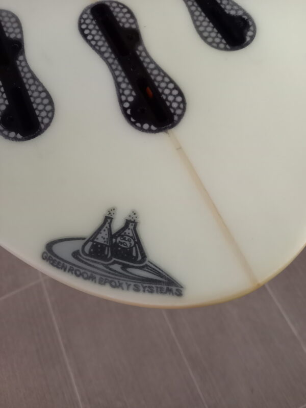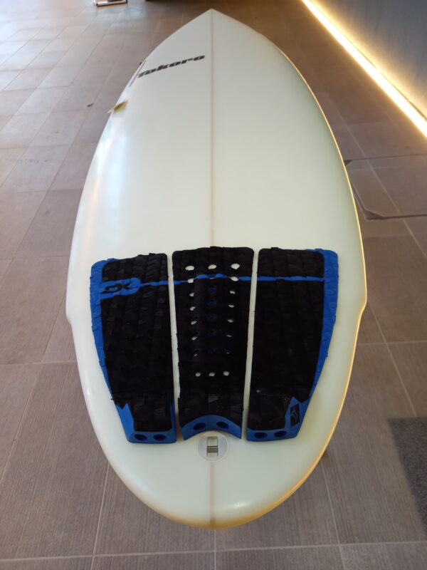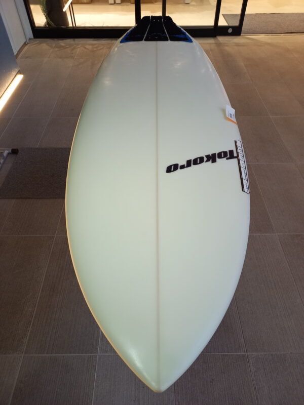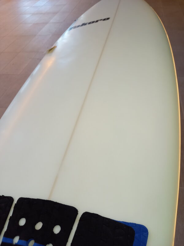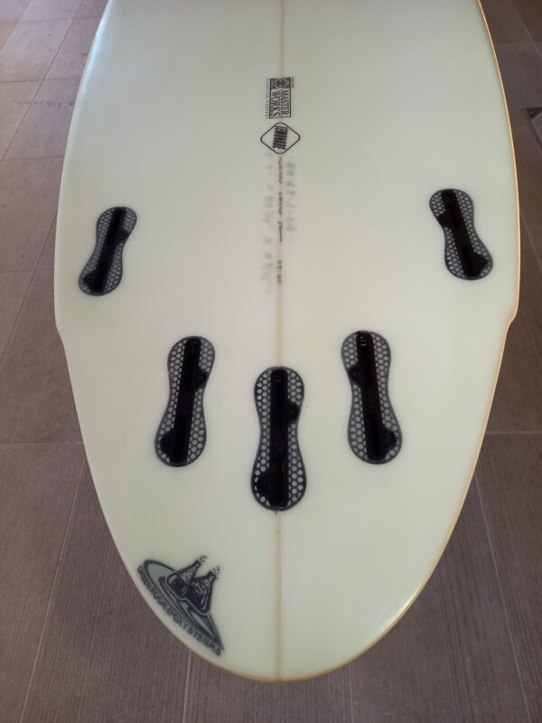 アウトラインにゆとりを持ったハイブリッドデザイン、ゆとりあるビークノーズ、レールはミディアム、ボトムはシングル~ダブル~Vee、テールはシングルウイングがセットされたラウンドテールにそれぞれデザインされています。ロッカーはノーズ・テール共にローに抑えられ、FCSⅡのマルチフィンセッティング、EPSフォーム、EPOXYレジンで軽量に仕上げられています。
