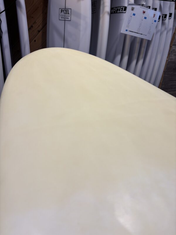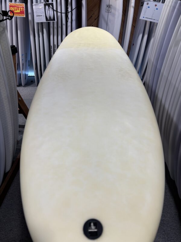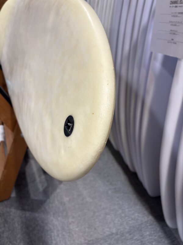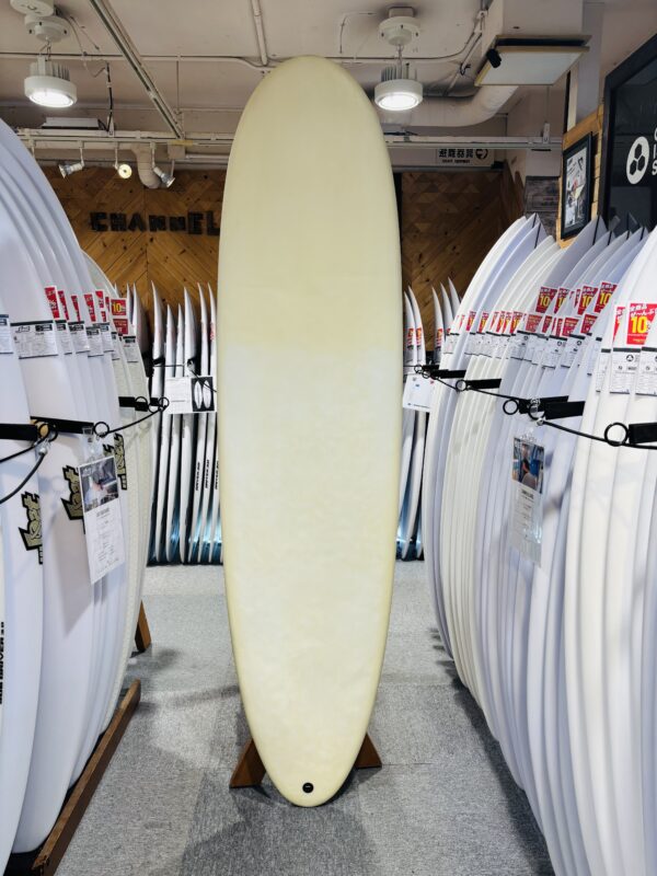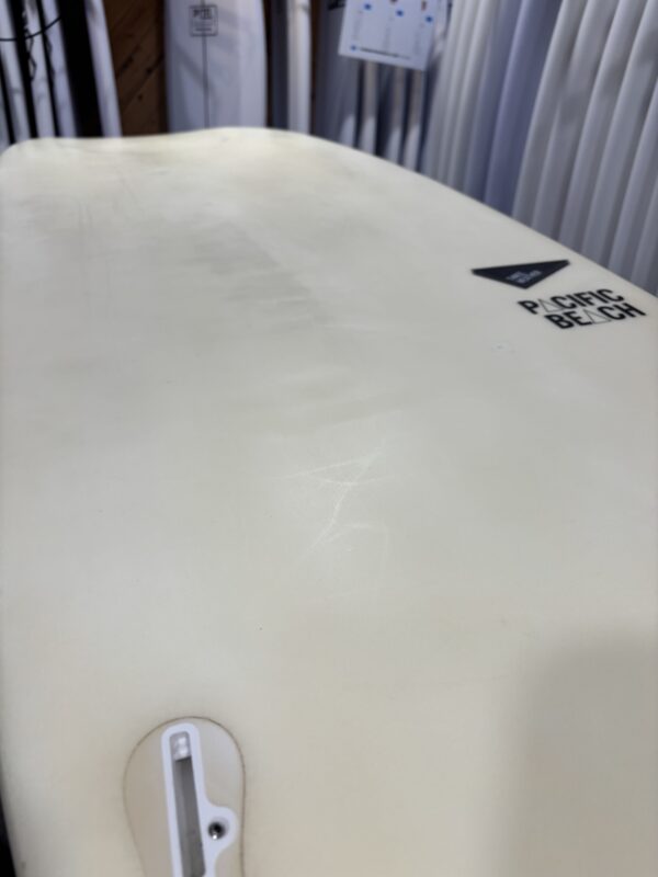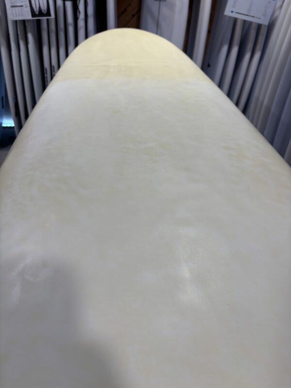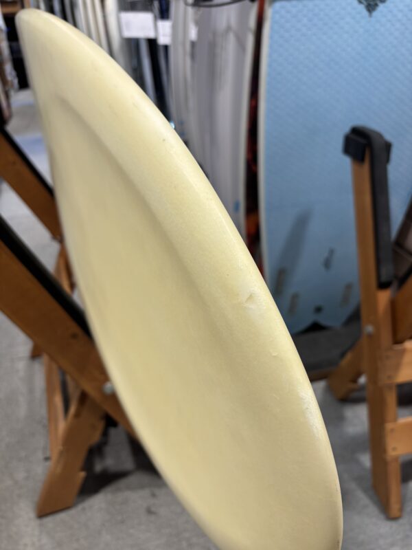 全体的に使用感ありEPSフォーム特有の黄ばみがあります。デッキ面のノーズエリアには横方向で凹みあり。フットマーク等の凹凸はフロントから後方に入ってます。ノーズ側面とボトム面にはセルフリペアがありますが樹脂で塞がってます。これからサーフィン始めたい方のコスパ・ファーストボードにはうってつけのボードです。