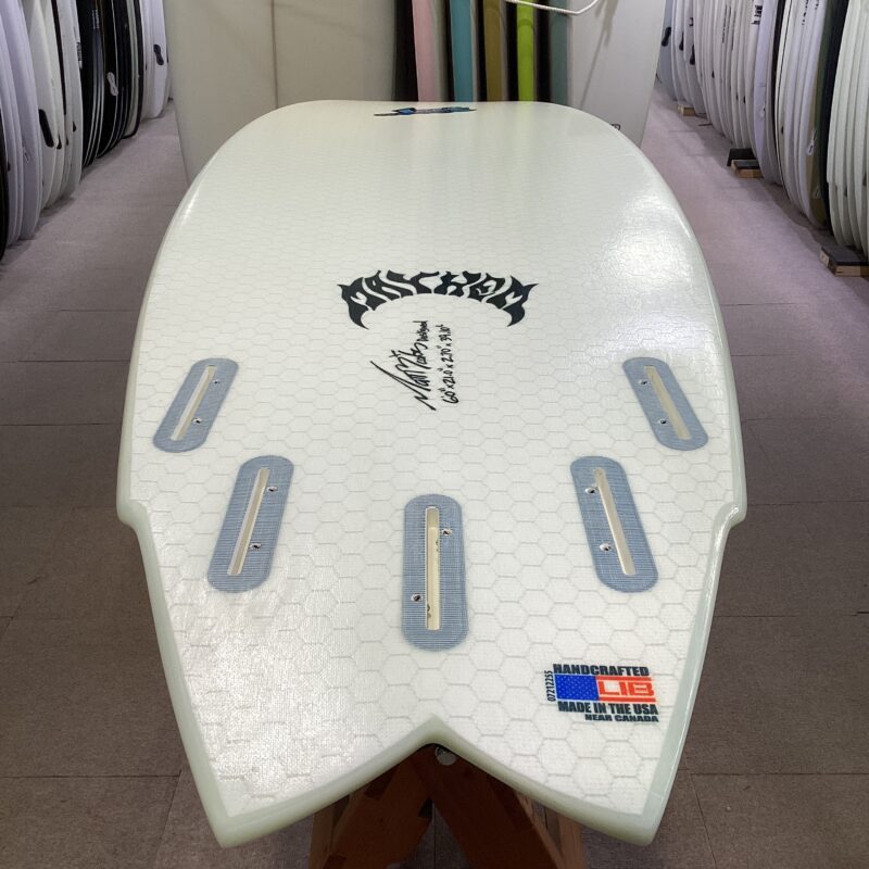 ローロッカーと前足下のシングルコンケーブでスピードコントロールを容易にしノーズにかけて小さくなるコンケーブで波にエントリーしやすくターン性能もアップ。センターコンケーブからテールにかけてのVeeがレールロッカーを生み出し、レールの波への食い込みがとてつもなく良く、波のフェイスでもリップでもアグレッシブなライディングを可能にしてくれるハイパフォーマンスなモデル。フィンの設定はツインでもクアッドでも2+1でもお好みで試してほしい。