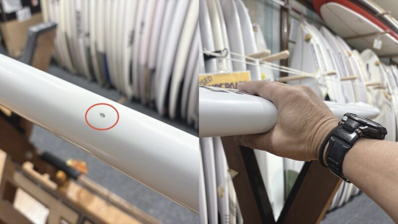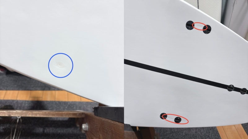 ボトム面、比較的キレイです。1か所修理 ( 青〇 ) 、FINBOXに凹み ( 赤〇 ) が有ります。