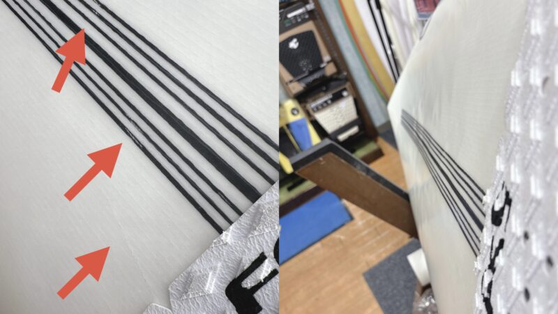 フットマークの状態です。カーボンの下にクラックがありますが、内側の浅いものなので問題ありません。