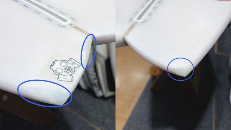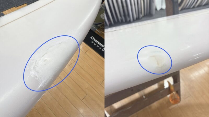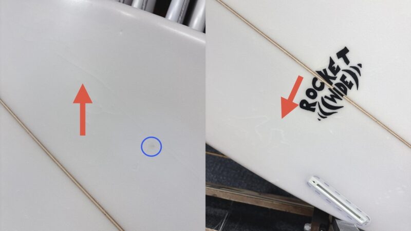 ボトム面、1ヶ所 ( 青〇 ) 修理をしています。矢印はスリキズです。