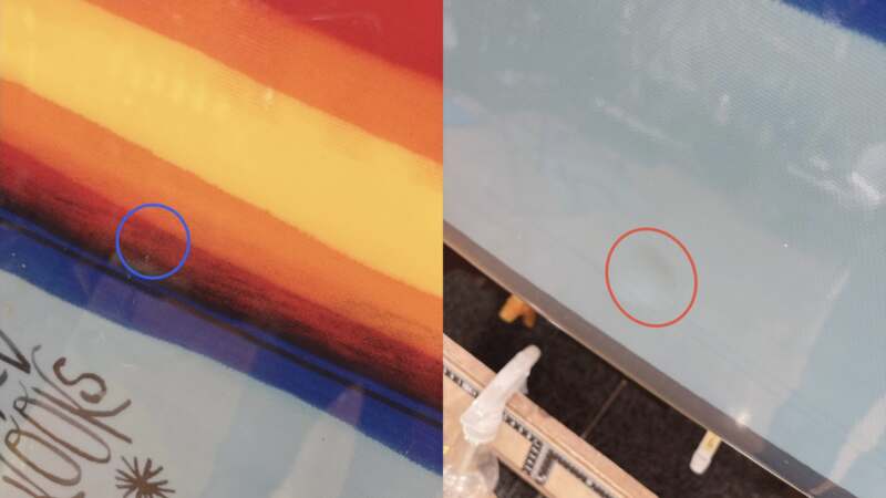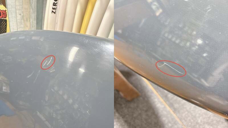 フットマークはこんな感じです、WAX UP時の傷が有ります。ストリンガー1か所 ( 青〇 ) 修理をしています。