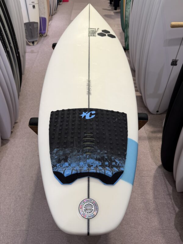 フロントフット下にシングルコンケーブが入っており、フィンとフィンの間でダブルになっています。フラットなテールとの相性がスピードとコントロールの完璧なバランスを生み出しています。