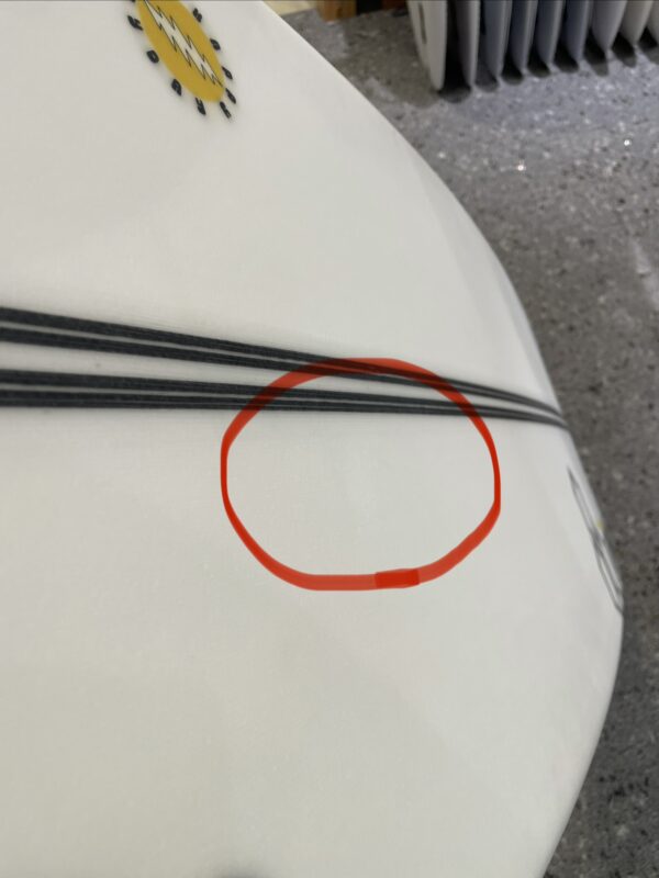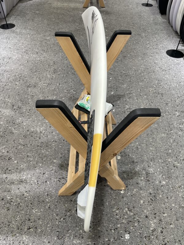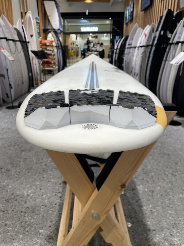 前足あたりのシングルコンケーブがアクセルとなり、フィンの間のダブルコンケーブが小波でもレールからレールへの切り返しを楽にしてくれる。