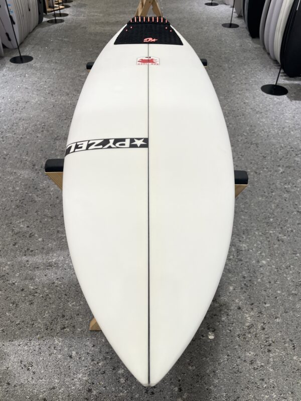 このボードのアイデアは、ジョンが競技の休憩中にいくつかの異なる「楽しい」ボードに乗り始めたときに生まれました。 昨年の彼のお気に入りは、私たちの新しいフラットロッカーFunformance ボードのWhite Tiger (5’6”) でポンピングよりも弱くよりスモールな波用でした。
