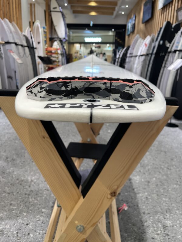 ノーズからテールまでの厚みバランスフォイルは最適なバランスが取れており、ボードの前半分は後ろ半分よりわずかに薄くなっています。 デッキはフラットでレールに向かってより多くのボリューム をキープします。 実際のレールはアウトラインとの適正 形状(ボードを腕の下に持っている場合は手の母指球の下) となっており、感度とレールの食いつきを維持するためにテーパーレールとなっています。