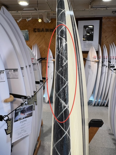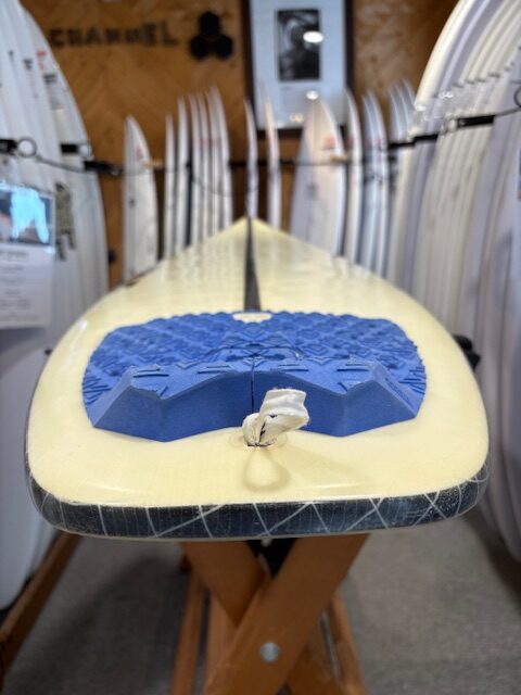 全体的な黄ばみや、リペア跡、フットマークなどは見られますが、大きなダメージのある傷はなくまだまだ乗れるサーフボードになっています。