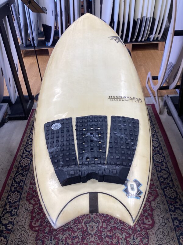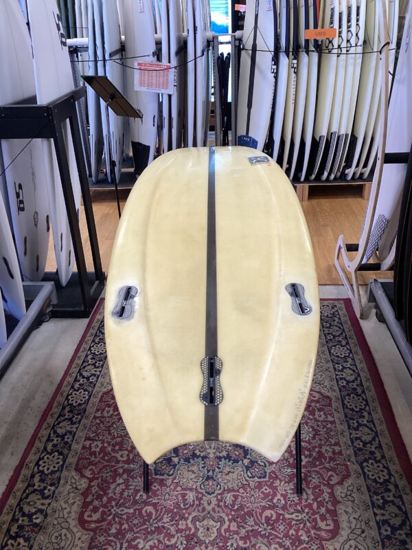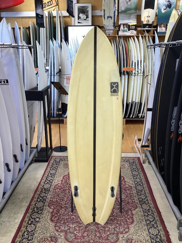 「小波やトロイ波の多い日本の波をイメージしてデザインされたサーフボード。なのでノーズ幅を広くして押しの弱い波でも浮いて走れるようにしている。でもロッカーは結構ついていて『AlmondButter』よりも強いかな?だから回転性もある。ノーズもテールも広めだけどエンドに向かって細くなっていく。そしてスピードと回転性の両方を兼ね備えたボトムが一番気に入っている。」とマチャドは語っている…