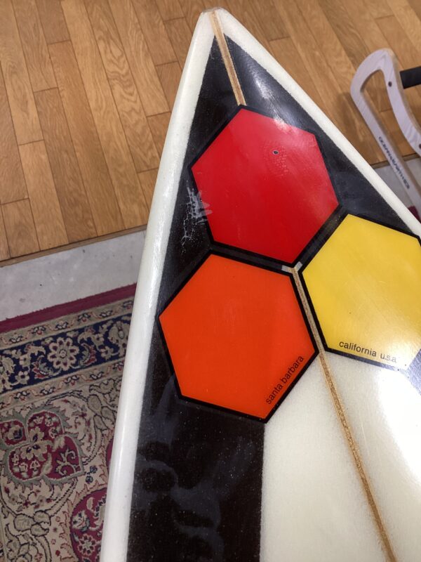 80年代中頃、トム・カレンがベルズビーチでオッキーを破り、ワールドタイトルを獲得したときに使っていたボードのレプリカ。