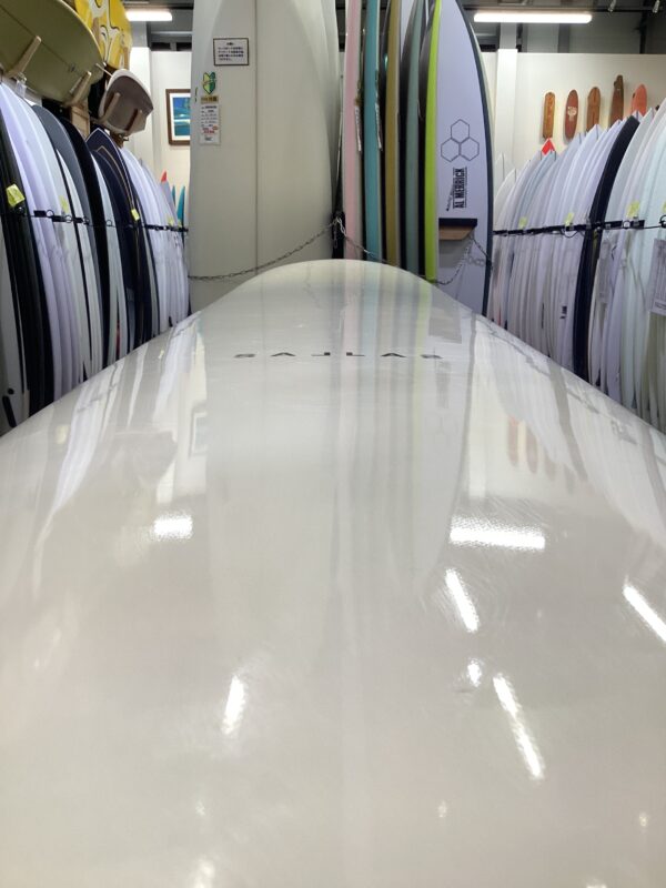 ワイドノーズが特徴のオールラウンドデザイン、ワイドなラウンドポイントノーズ、レールはミディアムボキシー、ボトムは浅いシングル~ダブル~VEE~FLATアウトに、テールはエッジ効いたラウンドスクエアにそれぞれデザインされています。ロッカーはノーズはミドル、テールはややミドル、シングルボックス+FCSⅡのサイドフィン、カラーはホワイトのグロス&ポリッシュに、軽量かつ高いフレックスが特徴のTHUNDERBOLT(TONBI社)REDで仕上げられています。
