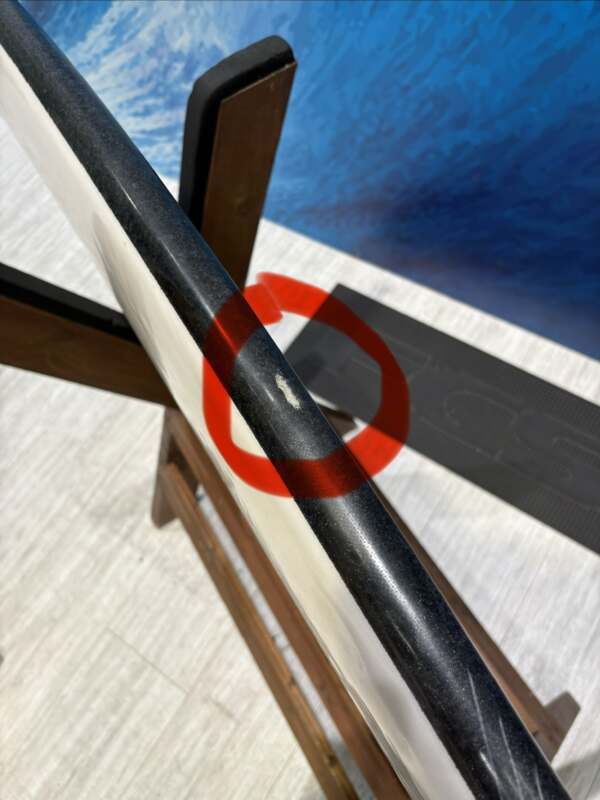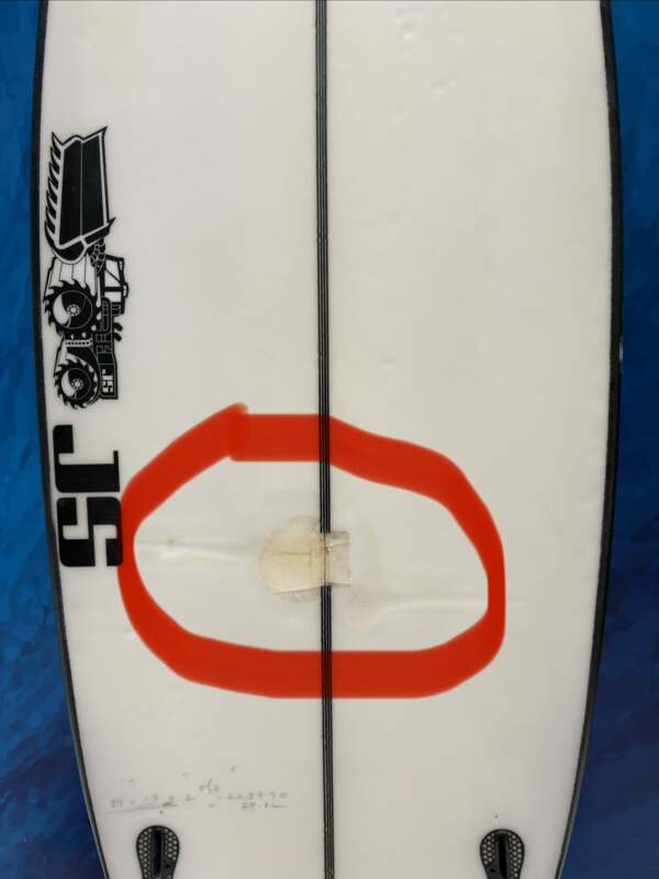 ボトムに1箇所大きいリペア痕があります。しっかりリペアされていますのでこのまま乗れます。