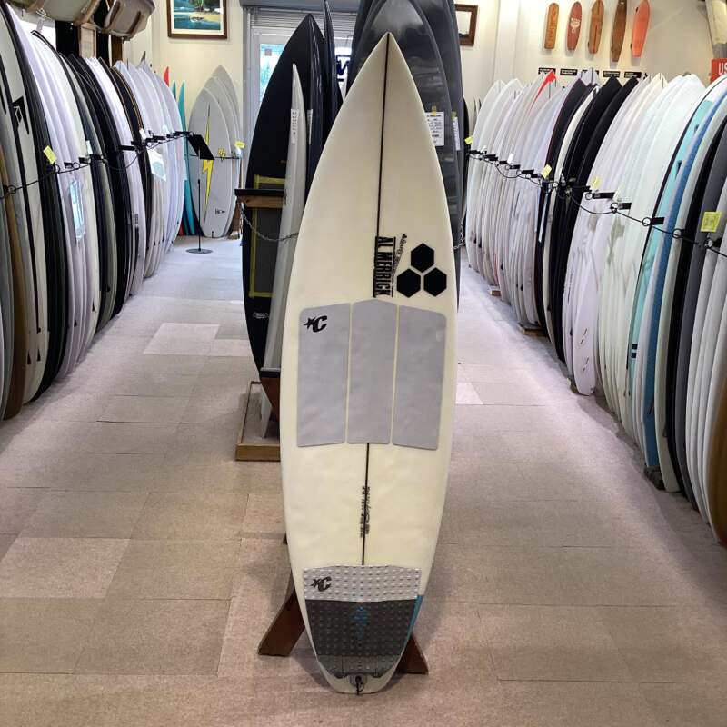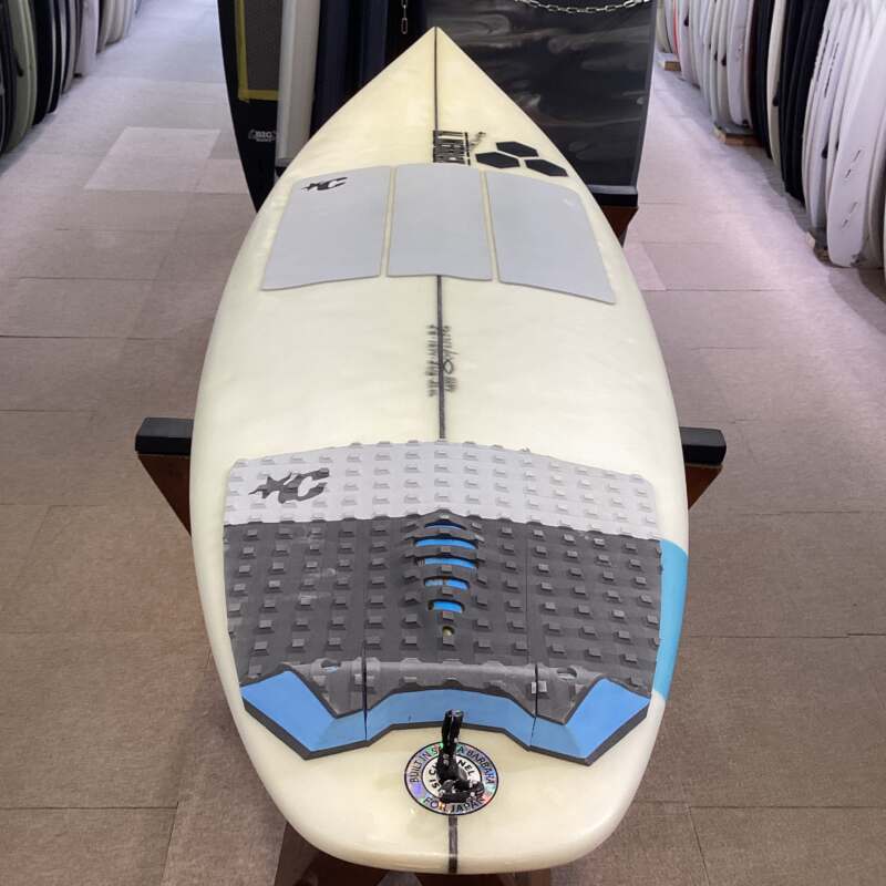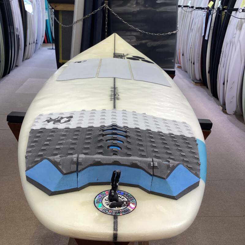 フロントフット下にシングルコンケーブが入っており、フィンとフィンの間でダブルになっています。フラットなテールとの相性がスピードとコントロールの完璧なバランスを生み出しています。