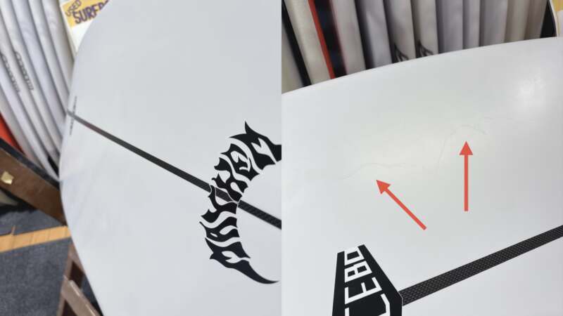 新品未使用品であっても、店舗にて展示中についた細かい傷がある場合もございます。中古ボード特有のものでございまして、価格がお安くなっている理由の一つでございます。