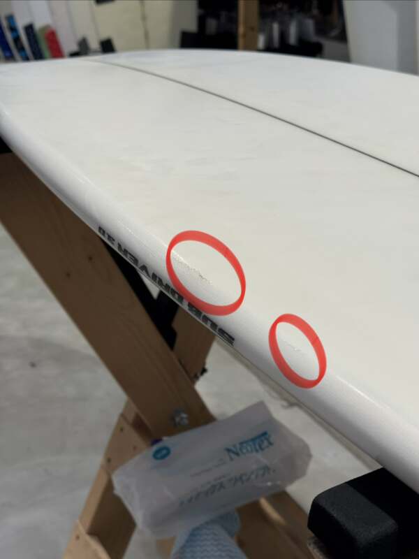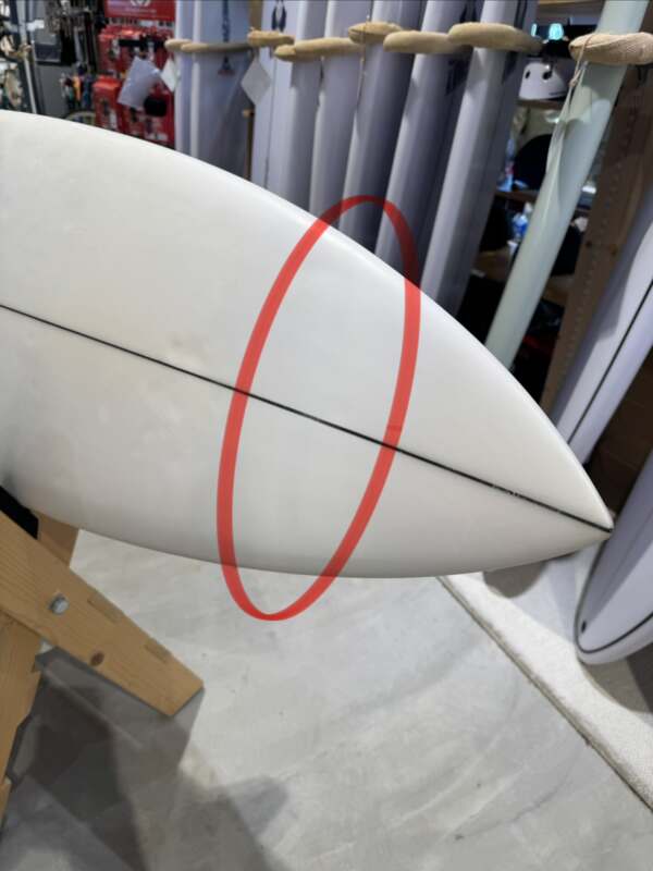 1.ノーズデッキ側: 修理跡が1か所あります。専門スタッフにより非常にきれいに直されており、写真でも分かりづらいレベルですが、赤丸写真をご確認下さい。ボトム側には跡がないため、しなりによるクラック程度と思われます。