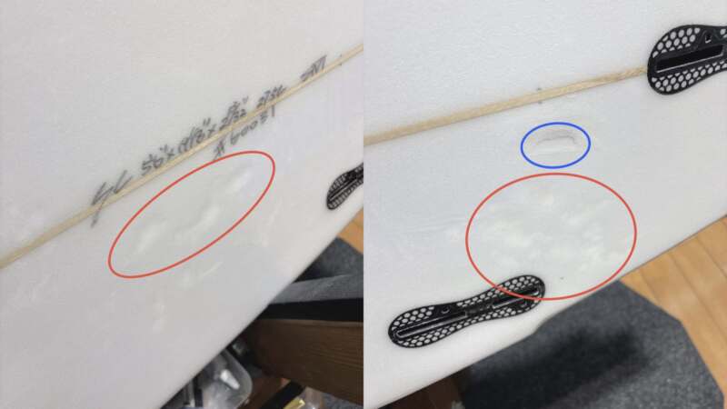 ボトム面、凹み・修理跡 ( 青〇 ) があります。